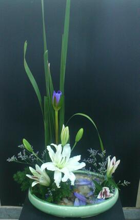 东方式盘花《暗香》(花材:百合、睡莲、香蒲叶、情人草、蓬莱松)