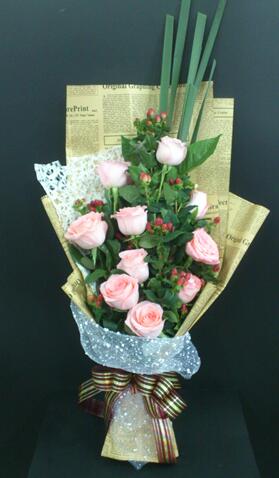 单面观花束(花材:月季、红果金丝桃、香蒲叶、栀子叶;