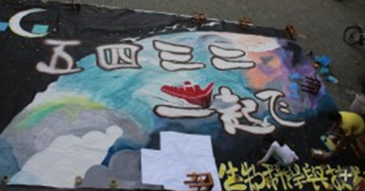 本网讯(大学生记者团 叶涛)近日,四号楼羽毛球场掀起一股“围观热”,路过学子纷纷驻足围观,迟迟不肯离去。在现场,记者看到生物科学与技术系7名学生正在绘画巨幅幕布,参与绘画的王昕说,“年轻就该与众不同。我们要用自己的方式为自己的节日庆祝”。