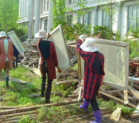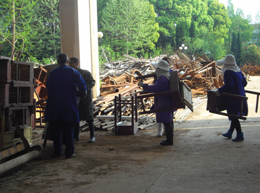 4月3日开始,学校对8号、9号教学楼仓库遭水淋湿的物资进行彻底清理,这些环卫工人们又充当起了搬运工的角色,他们身穿工作服,齐心协力,将1000多张课桌及其它杂物从阴暗潮湿的仓库里细细清理、一一搬出。库房满地污泥,空气污浊,需要清理的物品又数量庞大,他们天天忙得一身汗水,累得腰酸背痛,但大家却始终微笑着,没有一句抱怨。他们的质朴善良和吃苦耐劳,深深感动着我们周围的每一个人。