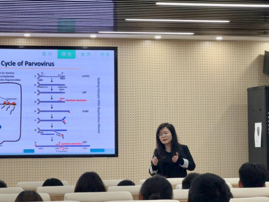 作为系列活动中聚焦“动手能力”的关键一环,朱老师的分享紧扣“实验场域”这一主题,生动诠释了从课本理论到科研发现的跨越路径。她并未局限于抽象的方法论阐述,而是将实验室的“幕后故事”搬上讲台。朱老师以自身研究课题为例,细致讲解了人博卡病毒、犬细小病毒相关研究思路与实验技术。她用通俗比喻拆解专业知识,将病毒入核比作进出地铁,把实验验证比作“现场取证”,把间接免疫荧光检测、ELISA、流式细胞术、实时荧光定量PCR、Western Blot等技术讲得通俗易懂。朱老师深入浅出地剖析了科学研究中的逻辑脉络,并通过形象的比喻,阐释了如何在繁杂的实验数据中溯源问题、挖掘真相。