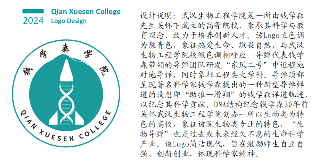 此次学院logo设计由钱学森学院联合艺术学院教师共同完成。最终选定的logo,其设计理念切合钱学森学院的创办理念,除了“工程类”“生物”涵义解读外,还有另外两层涵义,一是导弹图形(基座、弹头)有着“脚踏实地,仰望星空”之意,鼓励钱学森学院学生立足当下,追求崇高目标。二是具有“爱国”的涵义,围绕党的需要、国家需求,像导弹一样,指哪打哪。