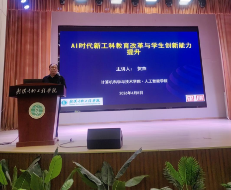 本网讯(通讯员 万德香)2026年4月8日下午,我校在小礼堂开展《AI赋能教育改革与学生创新能力提升》专题培训。培训由学校“双能双教中心”推广讲师贺杰主讲,“双能双教中心”常务副主任曹大有主持。计算机科学与技术学院·人工智能学院、智能制造学院、空间智能与工程学院教育职员、专兼职教师和教务处、教育教学督导室、晨光工程师学院和人事处全体教育职员参加此次培训。