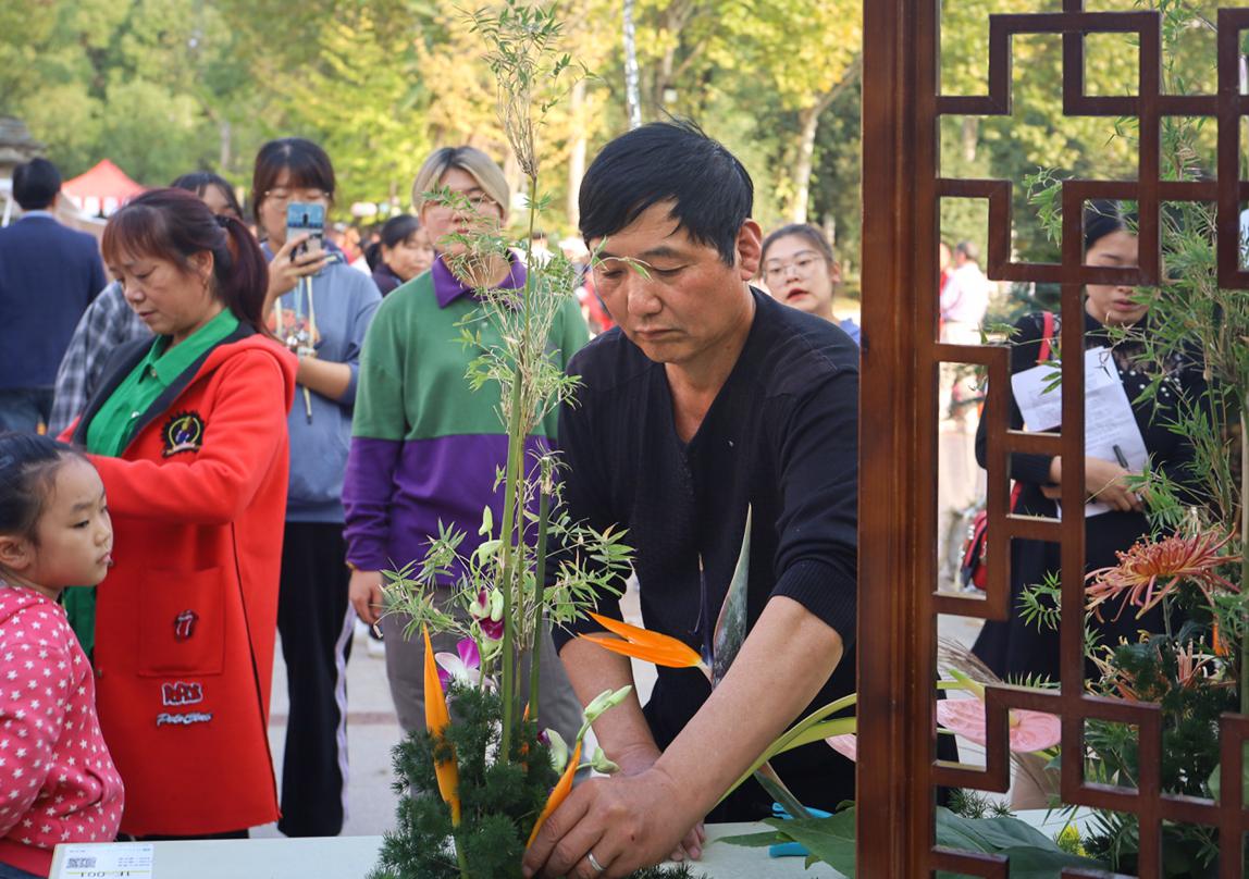 图为“工匠教授”辛高炉现场展示菊花主题花艺