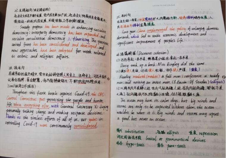 20级英本3班 程荣瑄 《英汉/汉英笔译》课程笔记中用不同的颜色划出重点,知识点脉络清晰,并对课堂知识进行补充和延伸,真正的做到了学思的结合。