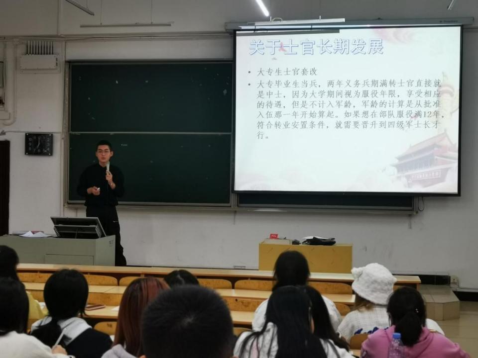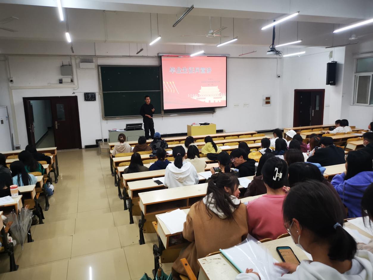 (通讯员:赵翠平)2022年10月27日晚,外国语学院在6#阶4召开大学生征兵主题宣讲会,外国语学院2021级英语本科5班退役士兵陈杨受邀为全院毕业生做宣讲,毕业班辅导员赵翠平主持宣讲会。