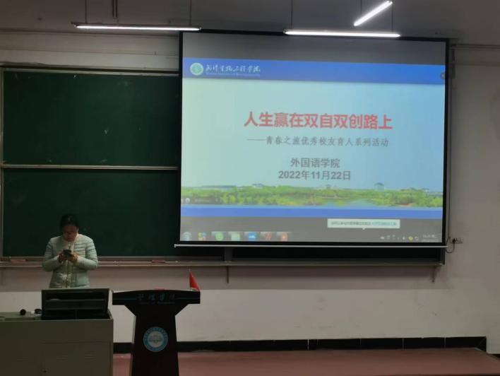 (通讯员:余子聪 王妃)2022年11月22日16点35分,“‘人生赢在双自双创路上’——外国语学院青春之旅优秀校友育人系列活动”在6号楼西方蓝报告厅举行。校友会特邀优秀校友谢丹,以线上和线下相结合的方式分享了她的学习、工作心得。外国语学院党总支副书记樊津老师、22级辅导员高亮老师出席了本次活动。