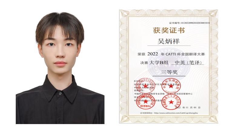 (通讯员:梅攀) 近日,由全国翻译专业学位研究生教育指导委员会和中国外文局翻译院主办、中国外文局CATTI项目管理中心负责实施的2022年“CATTI杯”全国翻译大赛全国决赛获奖名单揭晓。我校外国语学院2018级英语本科二班毕业生吴炳祥荣获“CATTI杯”全国翻译大赛“三等奖”。