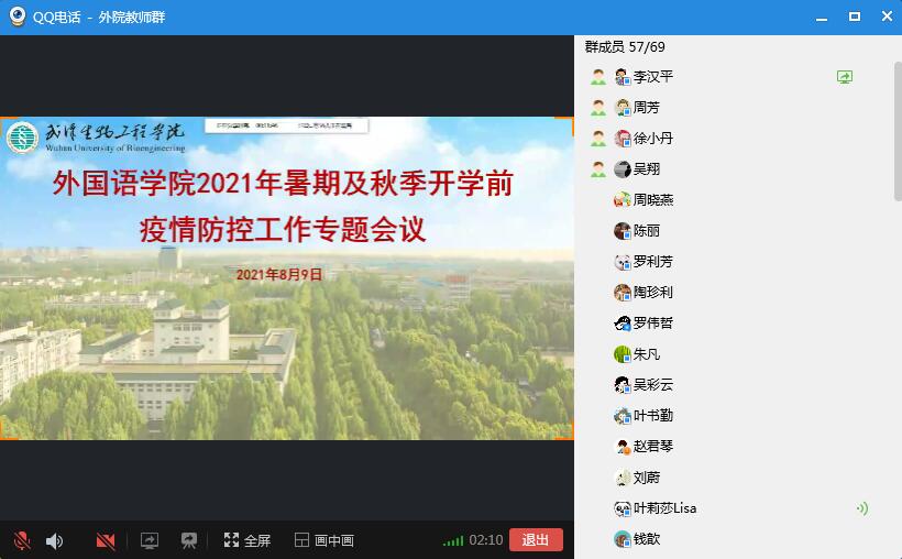(通讯员:李汉平)外国语学院8月9日10:00-11:00通过QQ群召开线上暑期疫情防控、长河金秋杯大赛等工作会议。会议由常务副院长方亚中教授主持,学院全体教职工参加。