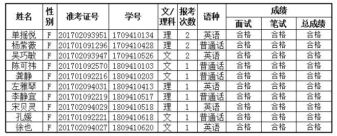 图为外国语学院2020年全国导游资格证考试合格学生名单