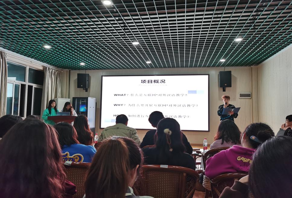 比赛开始前,党总支副书记陈静在致辞中表示本次大赛是探索外语教学改革和人才培养模式创新的重要载体,也是展示“产学研用”成果的重要平台。比赛中,15名项目团队负责人依次登场进行PPT路演,并接受评委提问。PPT路演环节展示了外院学子对创新创业的美好愿景:有宣传土家族文化的扬“美”“土”气项目,传承家乡的文化,带动地方脱贫致富;有依托外国语学院党员发展中心,成立红色青春宣讲团,传播党的理论知识,弘扬“四史”精神;也有互联网+“汉英桥”对外汉语教学,坚持独创的“主教+助教”的新型教学模式,采用“线上+线下”二合一的教学形式,为中西方文化交流提供了桥梁。项目团队独特的创意,主讲人所展现的朝气与自信赢得了现场热烈持久的掌声,评委精辟独到的点评将比赛推向了又一个高潮。