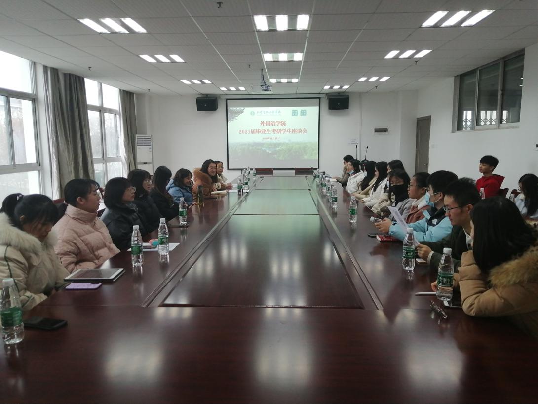 (通讯员 沈云 翁哲)12月15日下午,外国语学院在10号楼412召开2021届毕业生考研座谈会。外国语学院副院长辛凌、党总支副书记陈静、教师代表陈沙、周勇、樊津、毕业班辅导员沈云、2021届考研学子代表参加了会议。会议由陈静书记主持。