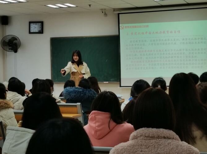 活动中,张宸、李盼盼同学为大家详细讲解了《习近平总书记教育重要论述讲义》。讲解内容主要围绕我国教育最鲜亮的底色、教育发展走自己的路、增强人民的教育获得感三个方面进行,重点阐述了教育重要论述中提及的坚持社会主义办学方向、坚持扎根中国大地办教育、坚持以人民为中心来发展教育。在新的历史条件下,习总书记提出的“教育兴则国家兴,教育强则国家强”的科学论断,明确了“大国办强教育”的发展路径,致力于发展具有中国特色、世界水平的现代教育,创办世界一流大学,培养服务于中华民族伟大复兴的新时代,为实现教育大国向教育强国的迈进指明了方向。