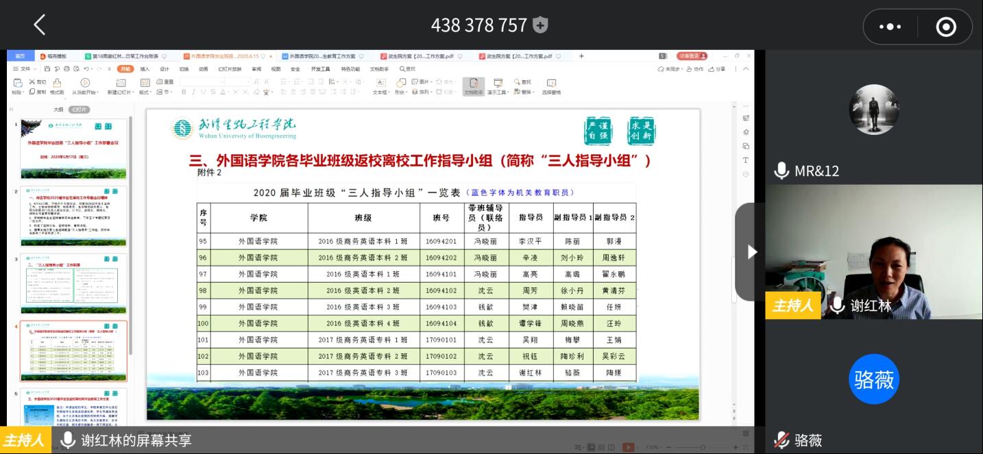 (通讯员:高亮)为加强2020届毕业生返校离校及毕业生教育工作的组织领导,切实以学生为中心,做好各项服务工作,6月17日,外国语学院利用腾讯会议平台组织召开毕业班“三人指导小组”工作部署会,副院长辛凌教授及担任毕业班指导员、副指导员的全体老师参会。会议由党总支副书记谢红林主持。