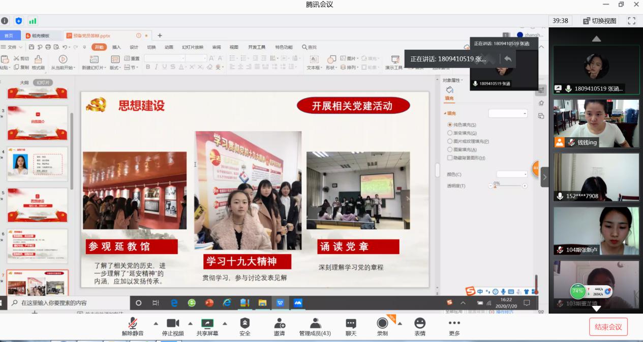 (通讯员 钱歆 陈宇)2020年7月20日,外国语学院18级学生党支部在腾讯会议上召开发展对象遴选线上答辩会。18级各班级初选出的34名入党积极分子参与此次答辩,答辩评审由18级学生党支部全体老师、17级学生预备党员代表担任。