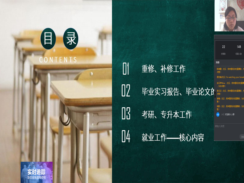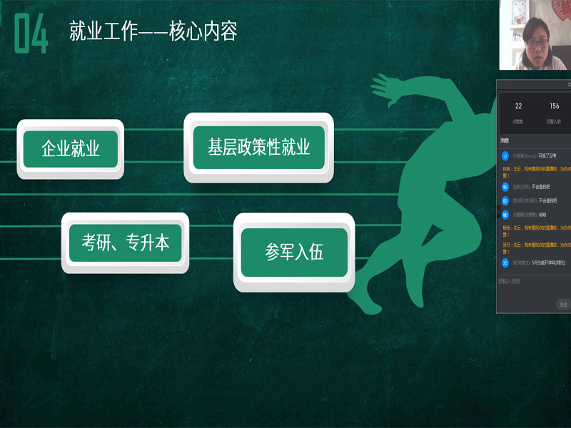 (通信员:高亮 沈云)受疫情影响,目前毕业生就业形势较为严峻,为更好的指导本届毕业生就业,外国语学院辅导员沈云老师开通“云课堂”系列直播,为毕业生做线上就业指导,帮助毕业生能尽快适应现状,树立信心,积极投入到网络就业工作中。“云”课堂系列直播板块分为毕业管理;基层就业,勇于奉献;就业形势与认知;纷说求职技巧;牢记求职安全等五个方面的内容进行,让疫情期间毕业生就业管控落到实处。