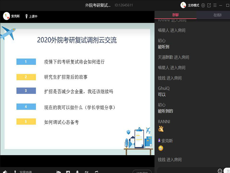 会后,冯老师从疫情当前就业形势出发,再次鼓励大家不要放弃升学机会,希望备考学生调整心态,充分利用网上资源做好复试准备,同时提醒大家认清形势,积极服从调剂,为自己争取更多的毕业选择。