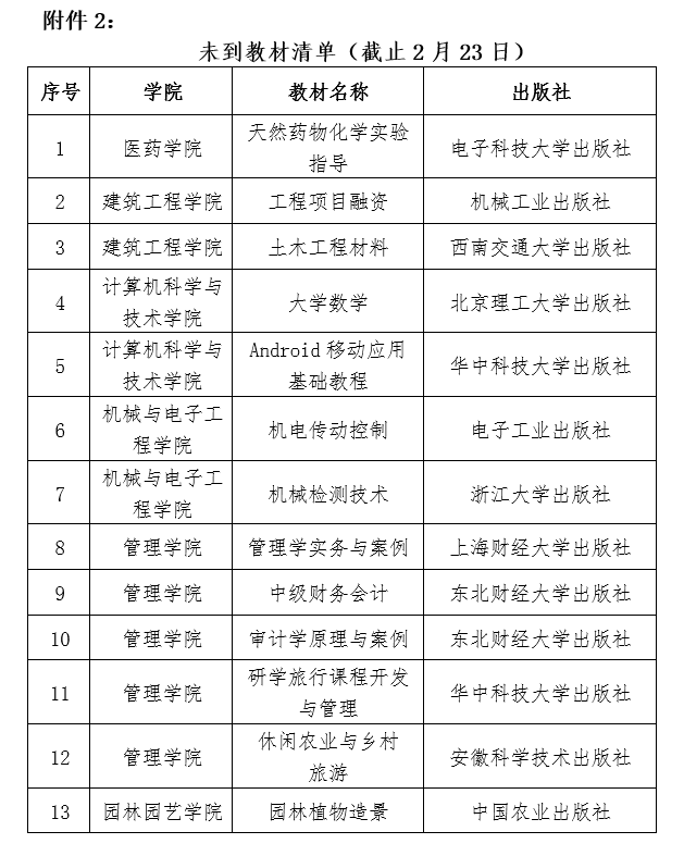 现有13种教材因出版社加印、天气、物流延时等客观原因尚未到货(详细清单见附件2),暂时无法发放,这部分教材将在货到后通知各班级前往领取。