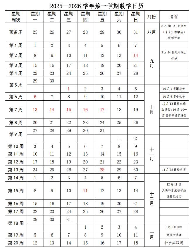 武汉生物工程学院2025-2026学年第一学期教学日历