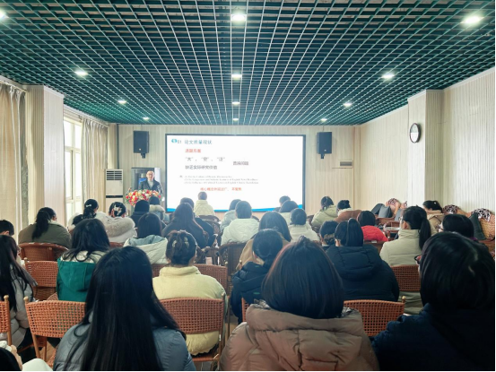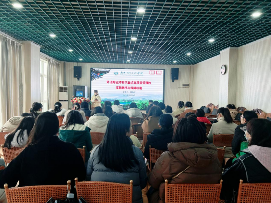 (通讯员 高娜)12月24日下午,武汉生物工程学院2025年第97期学术讲座在外国语学院10606教工俱乐部顺利举行。本次讲座由外国语学院主办,院长助理周逸轩副教授担任主讲,围绕“外语专业本科毕业论文质量管理的实践路径与保障机制”展开深入讲解。外国语学院党总支书记、常务副院长周芳主持,学院全体无课教师参加。