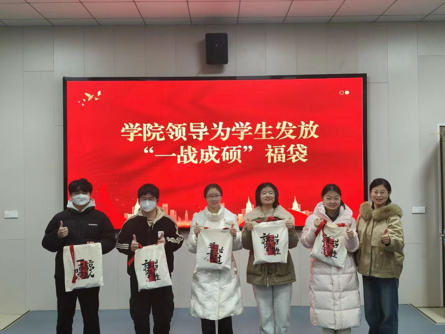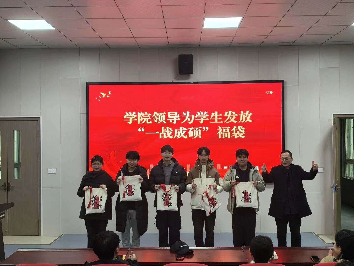 学院精心准备了寓意吉祥的“上岸福袋”,内含定制文具、脐橙、旺仔牛奶等礼品,由文学院党政领导亲自发放,传递暖心祝福。