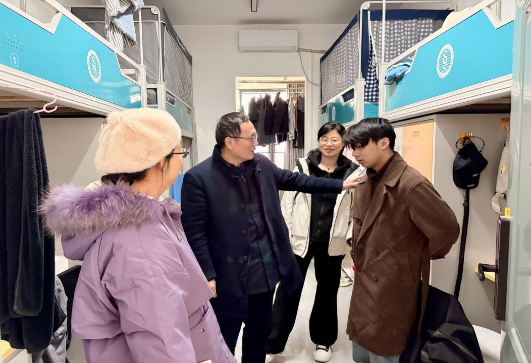 走访期间,学院领导老师深入中南公寓、三友园等多栋学生宿舍楼,与同学们亲切交流,询问假期安排、生活状况及困难需求。时值期末,文学院领导特别关注学生复习进度和心理压力,叮嘱同学们专心学业时注意防寒保暖、规律作息、维护身心健康,以最佳状态迎考。