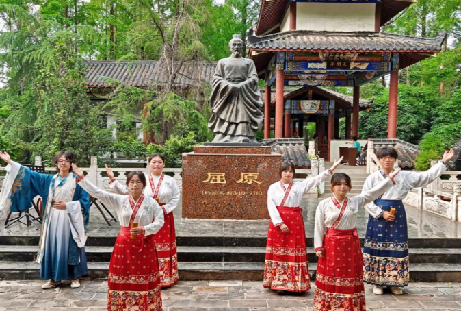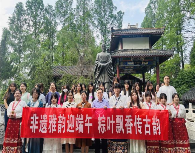 5月28日下午,文学院传统文化体验节之“粽”情端午活动在楚风院·求索书院举办,文学院师生代表齐聚一堂,共同参与这场文化盛宴。文学院院长余志平在活动中致辞。学生徐一翔等七位朗读者以饱满的情感朗诵了屈原作品的经典选段。学生李雨诺演奏了古筝《楚辞·九歌》;王紫语、韦嘉芙同学倾情演唱歌曲《离骚》;长龙书法社的成员们现场挥毫泼墨。此外,现场还设置了投壶、端午知识大问答等游戏,参与者还能领取寓意祈福纳吉的红绳,为自己和家人祈求安康幸福。