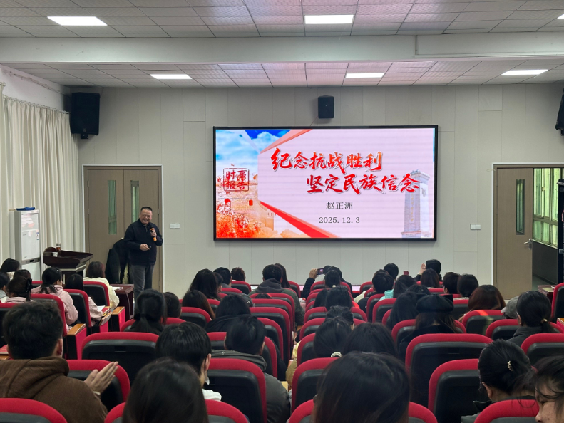 12月3日下午,校务委员会顾问赵正洲教授以《纪念抗战胜利坚定民族信念》为题,在4号教学楼报告厅为文学院百余名师生带来了一堂精彩的“形势与政策”课。赵正洲带领师生回顾了艰难曲折的14年抗战。他指出,这场战争历经了防御、相持、反攻三个阶段,中国共产党始终奋斗在抗战一线,是全民族团结抗战的中流砥柱。他表示,历史不容篡改,事实不容抹杀。台湾回归中国是二战胜利成果和战后国际秩序的重要组成部分。无论外部势力如何捣乱,中国终将统一,也必将统一的历史大势不可阻挡。