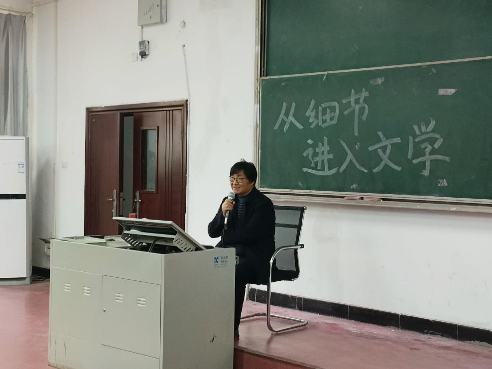本网讯 (通讯员 周晚霞 宋德慧 摄影 陈舒宁 李陆钰婷)3月22日下午,华中师范大学教授、博士生导师、湖北省作家协会副主席晓苏老师受邀来我校六号楼西方蓝报告厅作“从细节进入文学”专题讲座。文学院无课教师和汉语言文学专业学生代表参加讲座,讲座由文学院汉语言文学专业学科带头人张岩泉教授主持。