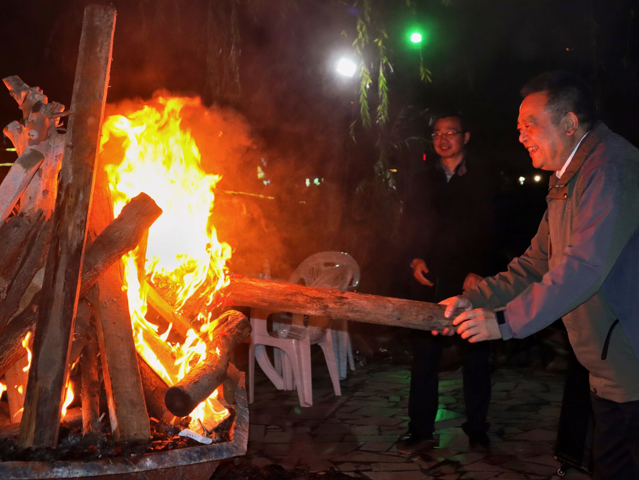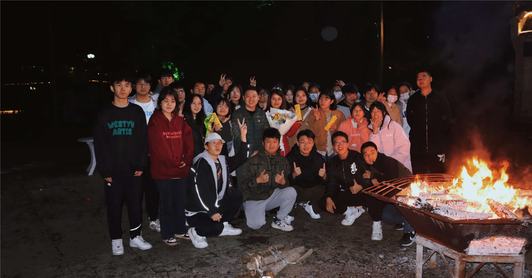 图为校务委员会顾问赵正洲与管理学院师生一起共同点燃篝火