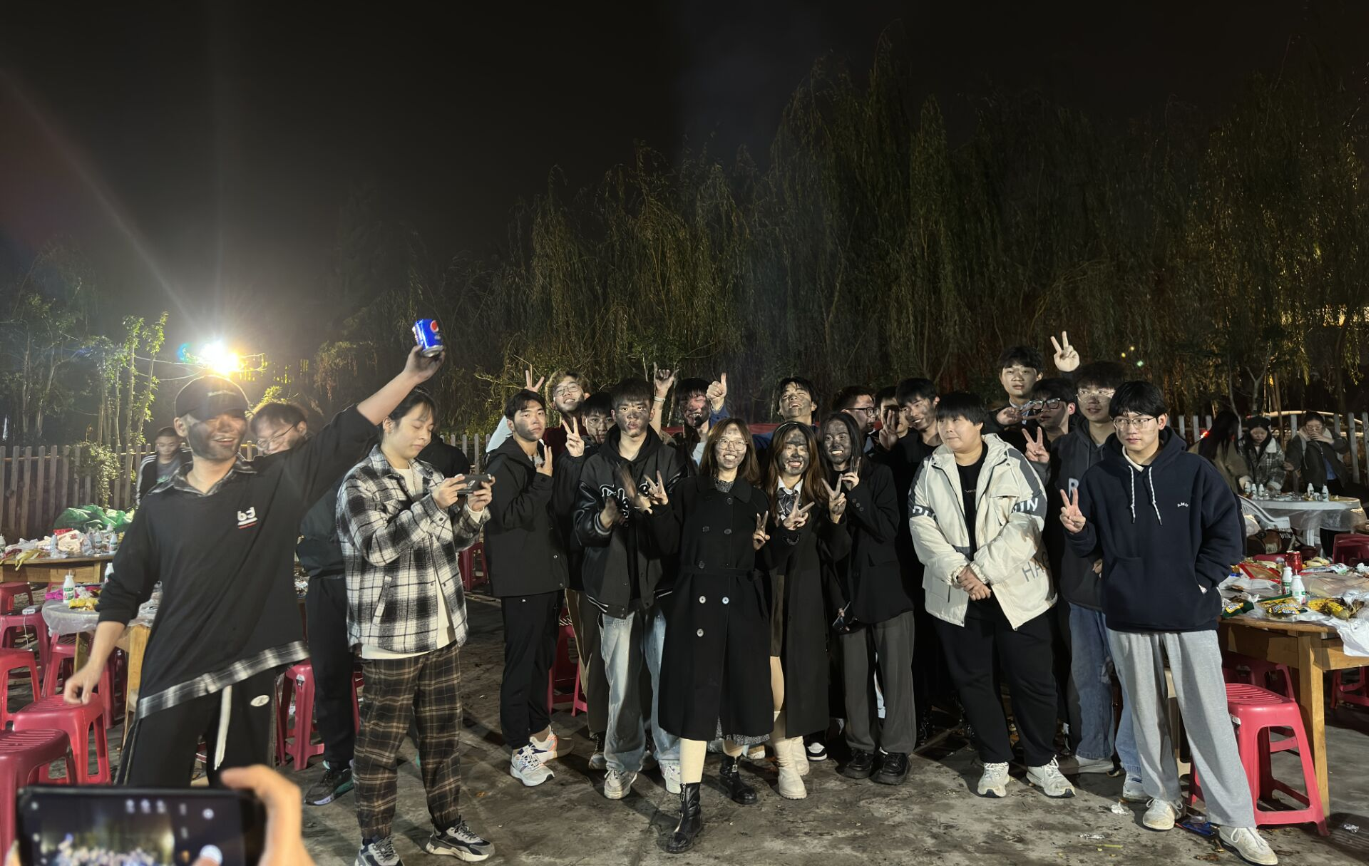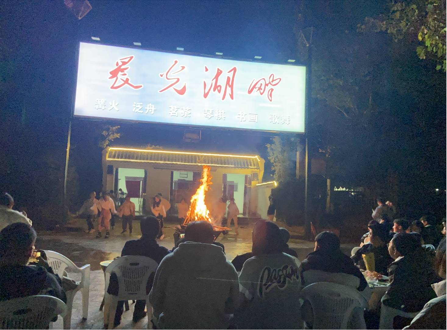 图为师生们围火就坐,唱歌跳舞品菊花茶