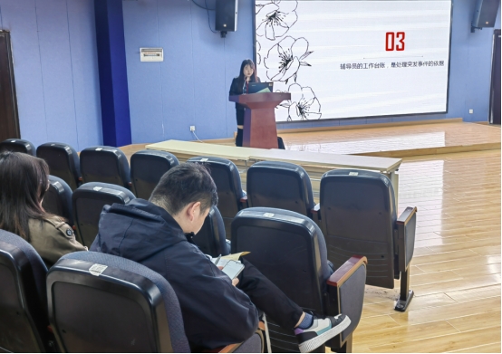 接下来,陈龙主任作《武汉生物工程学院安全用电管理办法(试行)》专项培训,他从学生寝室规范用电、学生寝室安全用电、学生寝室用电管理要求等方面详细解读了《武汉生物工程学院安全用电管理办法(试行)》。陈主任强调,辅导员们要结合案例向同学们讲清楚学校用电管理规定及其背后的道理,才能让学生心服口服。