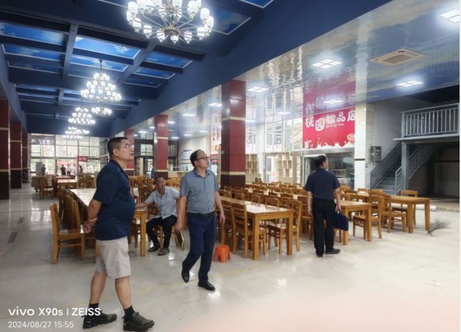 校党委书记江珩(左一)、校长助理余仕良(右一)检查学生餐厅