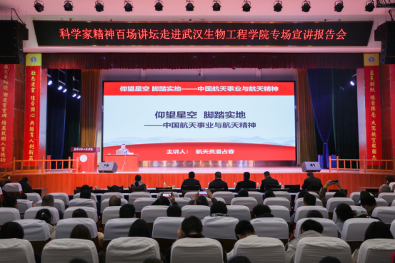 与此同时,“科学家精神百场讲坛”之武汉生物工程学院专场宣传报告会在学校大礼堂举行。中国首批航天员潘占春受邀登台,他结合自身航天员经历,娓娓道来鲜为人知的训练故事——72小时睡眠剥夺训练、极端天气下的野外求生技能、数倍体重的离心机训练,每一个细节都生动还原了航天人背后的艰辛与坚守,带领现场千余名师生共同重温中国航天的奋斗征程,深刻感悟航天精神的时代内涵。