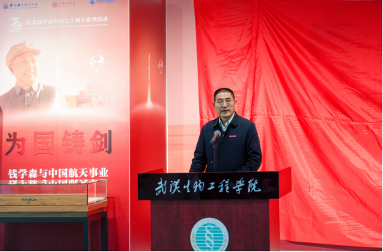 本网讯(记者程晓璐 叶涛 刘娜 摄影 陈冲)11月28日,我校隆重举行“纪念钱学森归国七十周年”系列活动,由中国科学技术协会、上海交通大学、中国航天基金会联合主办的“为国铸剑——钱学森与中国航天事业”展览同步开展。特邀钱学森之子、上海交通大学钱学森图书馆馆长钱永刚,钱学森生前秘书、中央军委科技委原综合局大校顾吉环,中国首批航天员潘占春,上海交通大学图书馆执行馆长李芳,湖北省文化和旅游厅博物馆和社会文物处副处长孙立以及武汉市科学技术协会,长江新区党工委宣传部,长江新区教育局、阳逻街等单位负责人和校领导余毅、蔡红生、赵正洲及师生代表出席展览揭幕式和报告会。