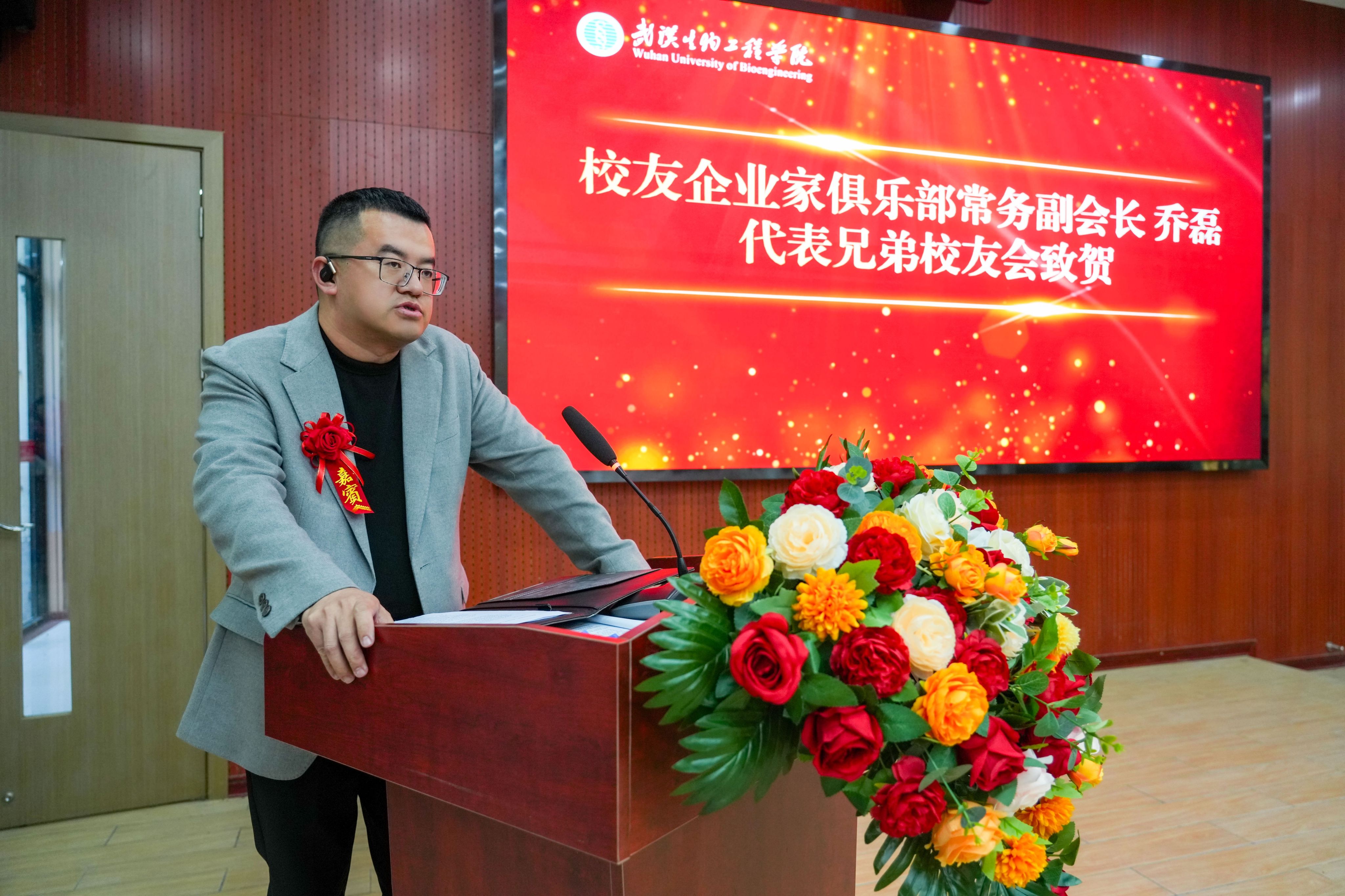 校友企业家俱乐部常务副会长乔磊代表兄弟校友会致贺词。他表示,外贸行业校友会的成立,为广大校友搭建了一个资源共享、经验互通、合作共赢的优质平台。校友企业家俱乐部期待与广大外贸行业校友抱团前行,在复杂的国际市场中携手开拓属于武生院校友的新天地。