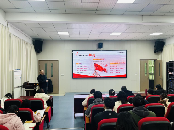 赵正洲以习近平总书记在纪念中国人民抗日战争暨世界反法西斯战争胜利80周年大会上的重要讲话导入,带领师生回顾了艰难曲折的14年抗战。他指出,这场战争历经了防御、相持、反攻三个阶段,中国共产党始终奋斗在抗战一线,是全民族团结抗战的中流砥柱。作为世界反法西斯战争的东方主战场,中国人民以巨大的民族牺牲,为拯救人类文明、保卫世界和平作出了重大贡献。抗战胜利洗刷了近代中国的屈辱,重新确立了中国在世界上的大国地位,开辟了中华民族伟大复兴的光明前景。他鼓励同学们走进学校世纪风云馆等文博场馆,深入学习领悟“伟大抗战精神”的内涵,吸取前进力量。