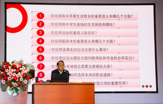 在专家报告环节,湖北省生涯教育研究会会长张金元作题为《加强高中学生生涯教育对策思考》的主旨报告。他紧扣新高考改革背景,结合一系列真实案例,强调生涯教育对学生实现“知彼知己、科学决策”的重要作用。他系统阐释了匹配论、阶段论、学习论、建构论等八大生涯教育理论,并从协同机制、课程衔接、平台搭建等方面,提出了高中与高校合力推进生涯教育的实施路径。整场报告既有理论高度,又具实践导向,为构建贯通式协同育人新生态提供了清晰而务实的思想指引与行动参考。