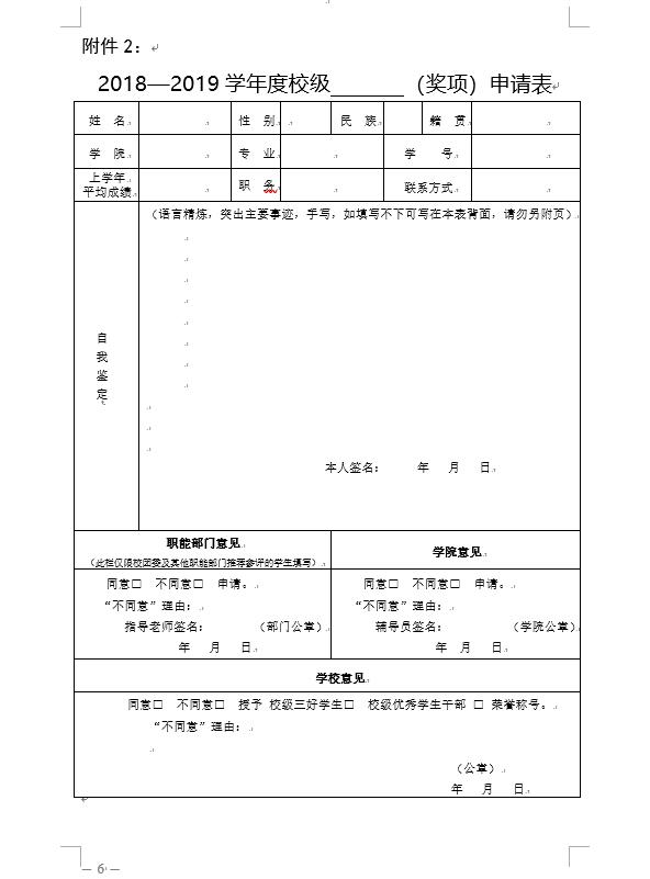 (一)学生个人提出申请,并填写《2018—2019学年度校级 (奖项)申请表》(附件2)。其中,由校团委及其他职能部门推荐参评的“校级优秀学生干部”需同时提供“职能部门意见”和“学院意见”。每名学生只能参评一项。