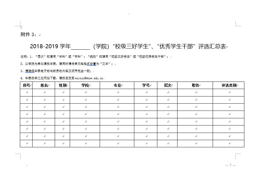 (二)各学院于9月13日前将《2018—2019学年度“校级三好学生”、“校级优秀学生干部”评选汇总表》(附件3)、评选报告(包括名额分配、评选过程、公示情况等内容)加盖学院党总支公章后,连同《2018—2019学年度校级 (奖项)申请表》一并交学生工作处,同时将填报的《2018—2019学年“校级三好学生”、“校级优秀学生干部”评选汇总表》电子版发送到学工信箱(wsyxsc@whsw.edu.cn)。