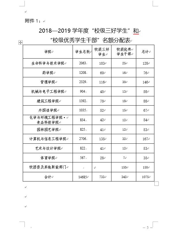 (一)各学院评选表彰的“校级三好学生”不超过本学院学生总数的5%,“校级优秀学生干部”总数不超过本学院学生干部(不含团干)总数的5%(评选名额见附件1)。