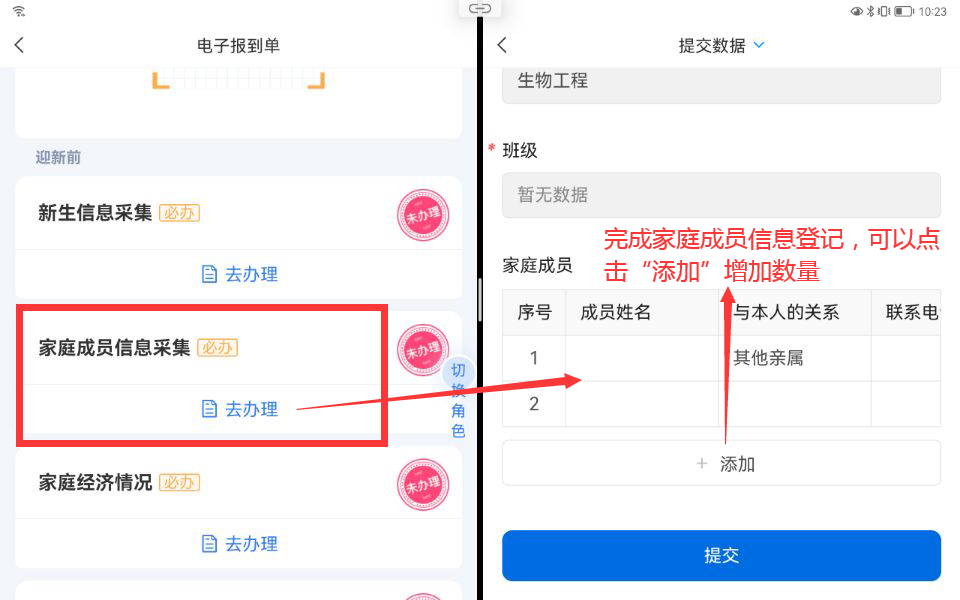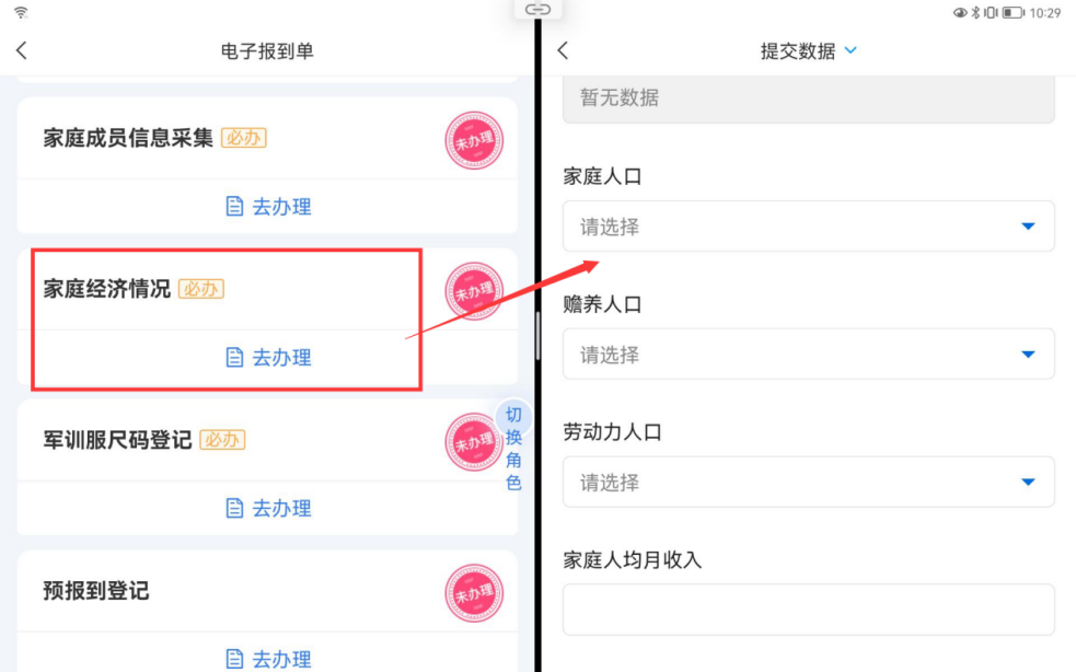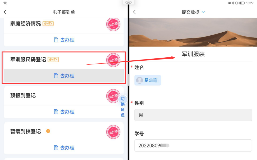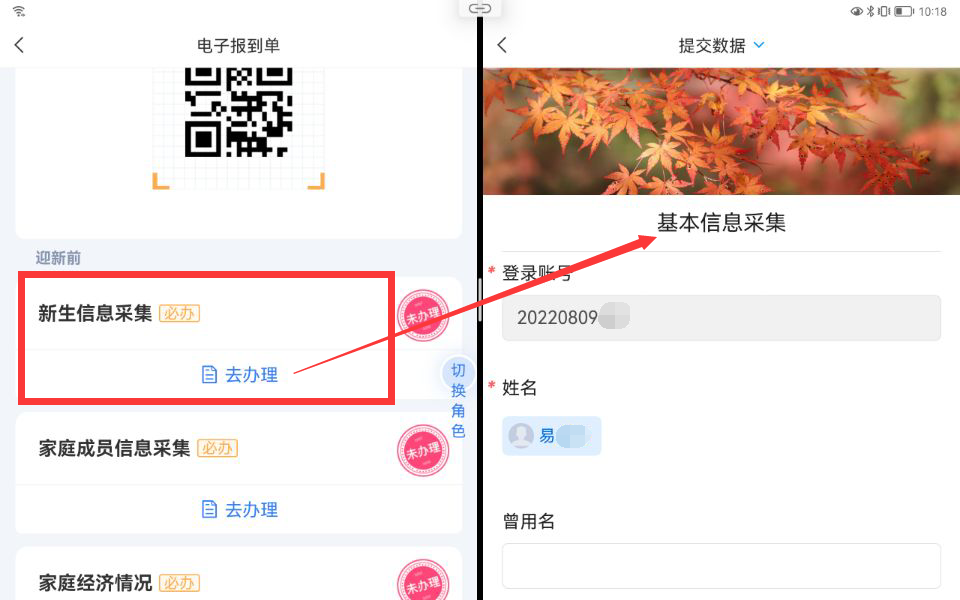 进入迎新页面后,填写报到前必办项目。【非必办项目新生可按需办理】