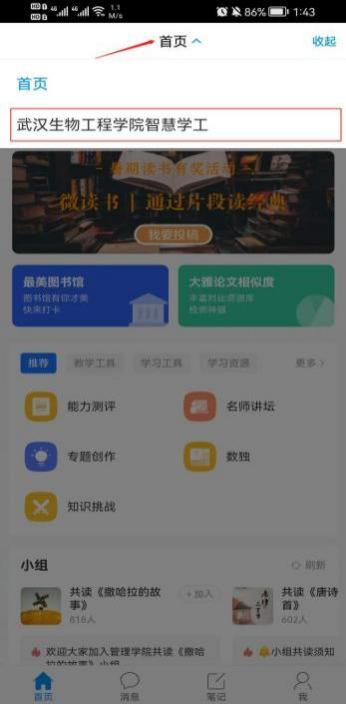 账号激活后,下载/打开学习通APP,输入账号激活时所用的手机号码以及所设置的密码登录,点击首页,切换至“武汉生物工程学院智慧学工”。