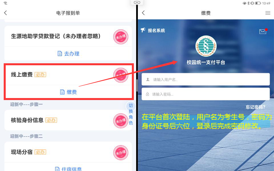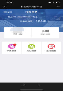 点击进入校园统一支付平台按照操作流程完成缴费,缴费完毕,显示已办理。