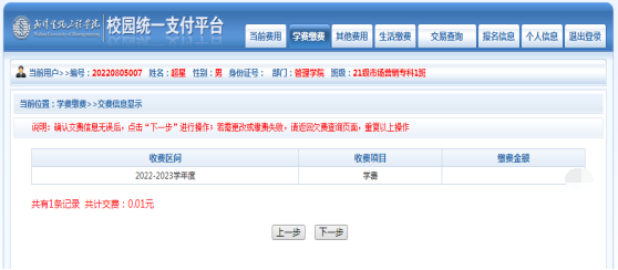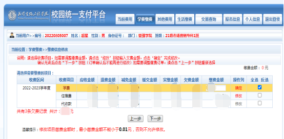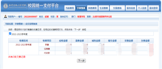 2.重新登录系统,核对个人信息。点击“学费缴费”, 核对应缴费项目及金额,点击“下一步”。