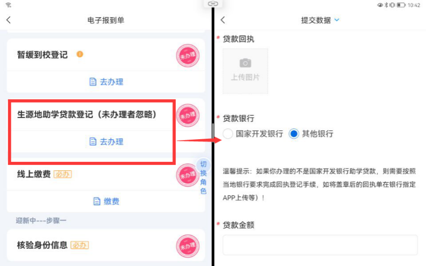 第八步:生源地助学贷款登记(未办理者忽略)。办理了生源地助学贷款的同学如实完成自己的贷款信息登记,便于学校资助中心、财务处完成后续资助服务等。在缴费时,从应缴总额中扣除贷款部分。