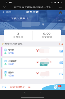 注意事项:(1)如已办理生源地助学贷款的同学,请根据助学贷款金额,修改学费金额,仅缴纳剩余学费、住宿费、医保及其他项目。(2)2024年度“大学生医保”缴费标准以武汉市医疗保障局公布为准,如已在当地缴纳“城乡居民基本医疗保险”,请不再缴纳“大学生医保”。