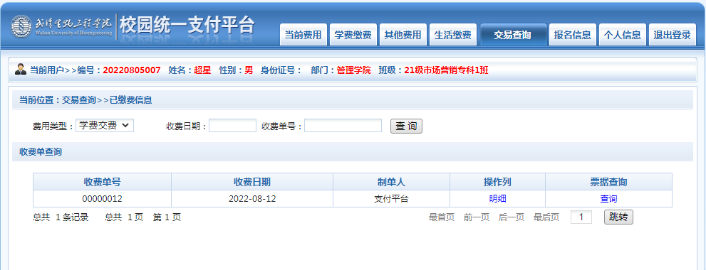 6.缴费成功后,返回首页,点击“交易查询”-“已交费信息”-“票据查询”,获取电子缴费收据,并可下载和在线打印。