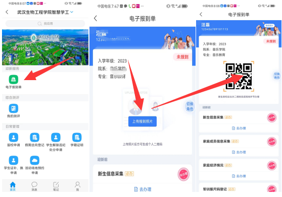 第一步:点击进入电子报到单界面,上传报到照片,核对个人录取信息。