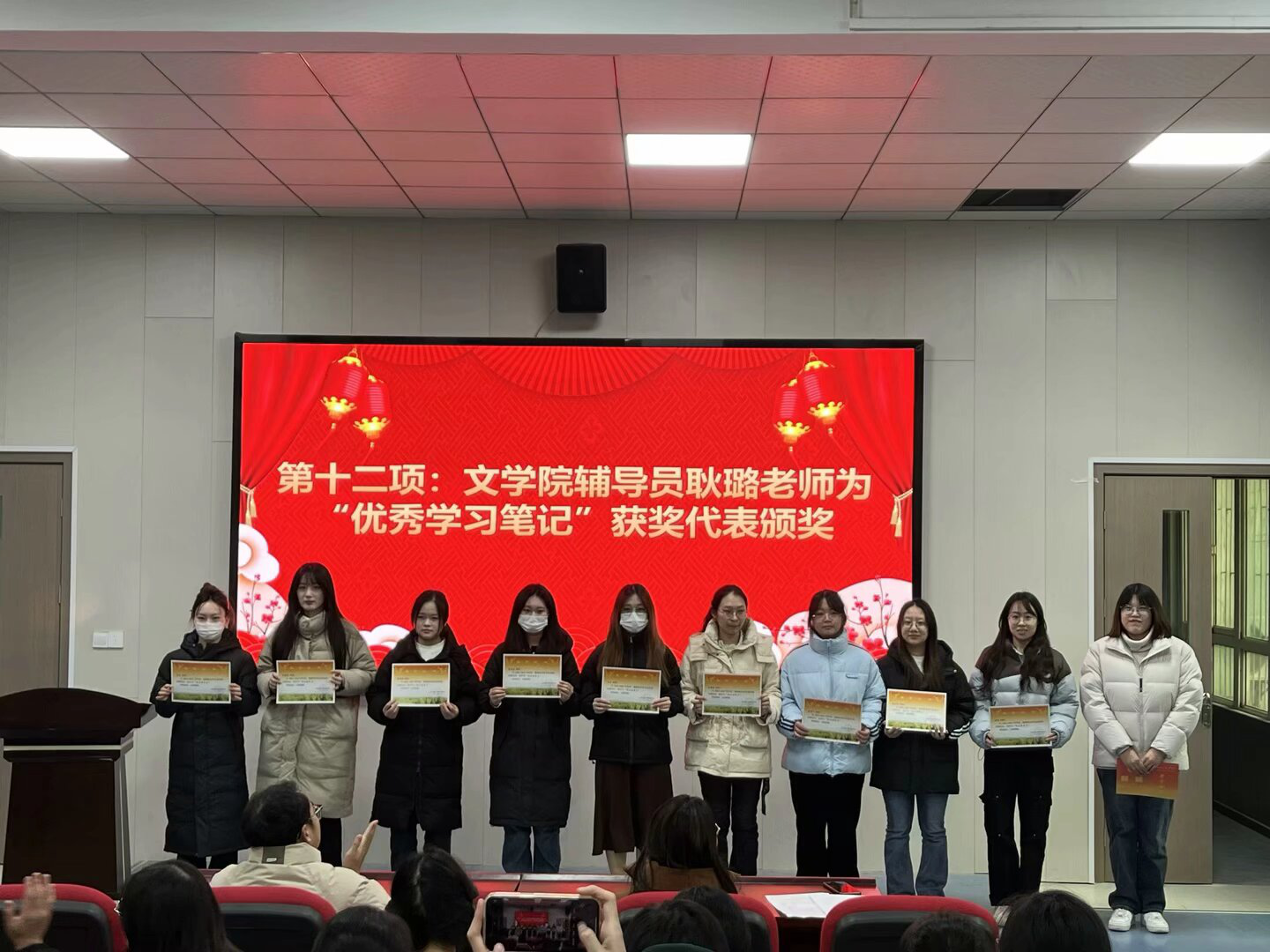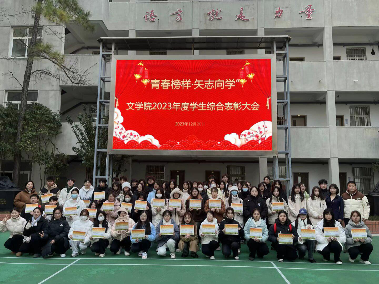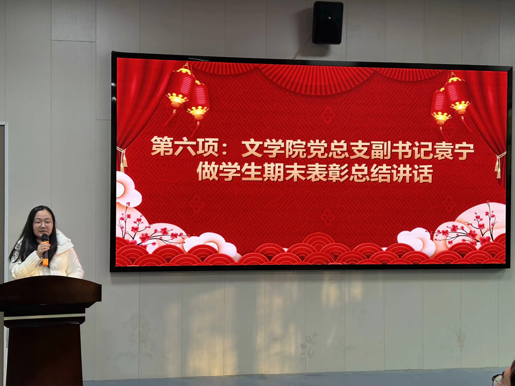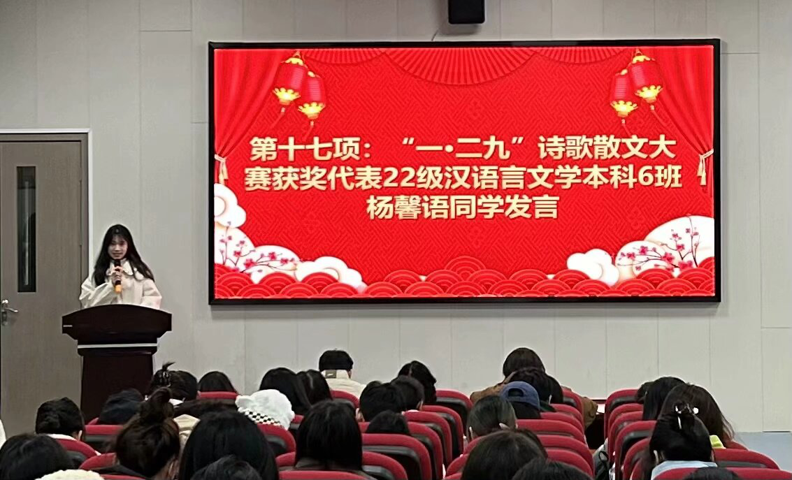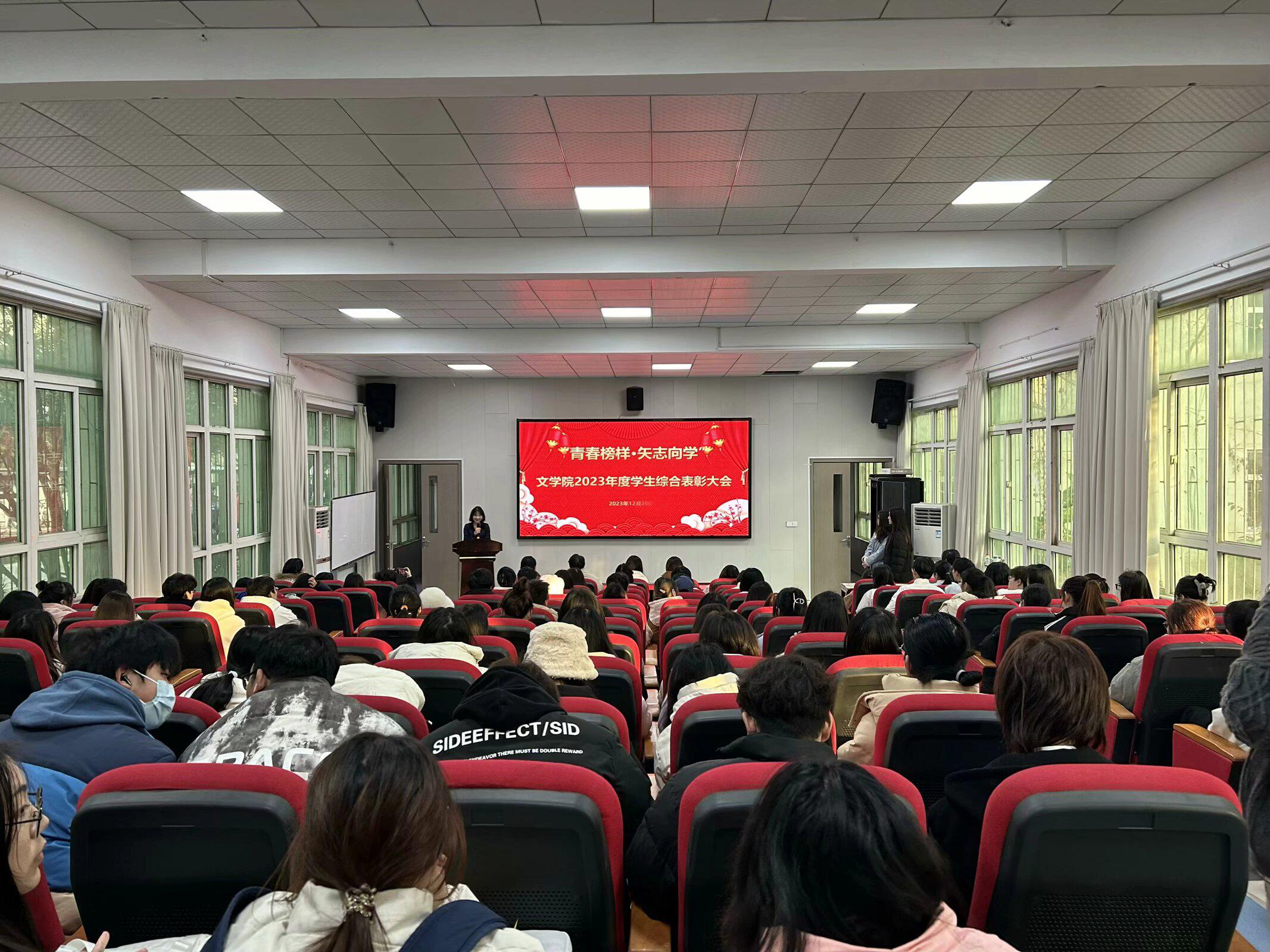 本网讯(通讯员 吴梦冉 王瑾 摄影 汤宇辰 赖蔚然)12月20日下午,文学院在四号楼一楼玉兰报告厅召开“青春榜样·矢志向学”学生综合表彰大会。文学院党政领导、全体辅导员、教师代表,2023年新发展党员、新发展团员、校院五好学生获奖代表、校院优秀学生干部代表、学习进步奖代表、优秀学习笔记获奖代表、团支部风采大赛获奖班级代表、湖北省第三十九届“一二·九”诗歌散文大赛获奖代表等学生代表参会。会议由21级汉语言文学专业学生李晓燕主持。